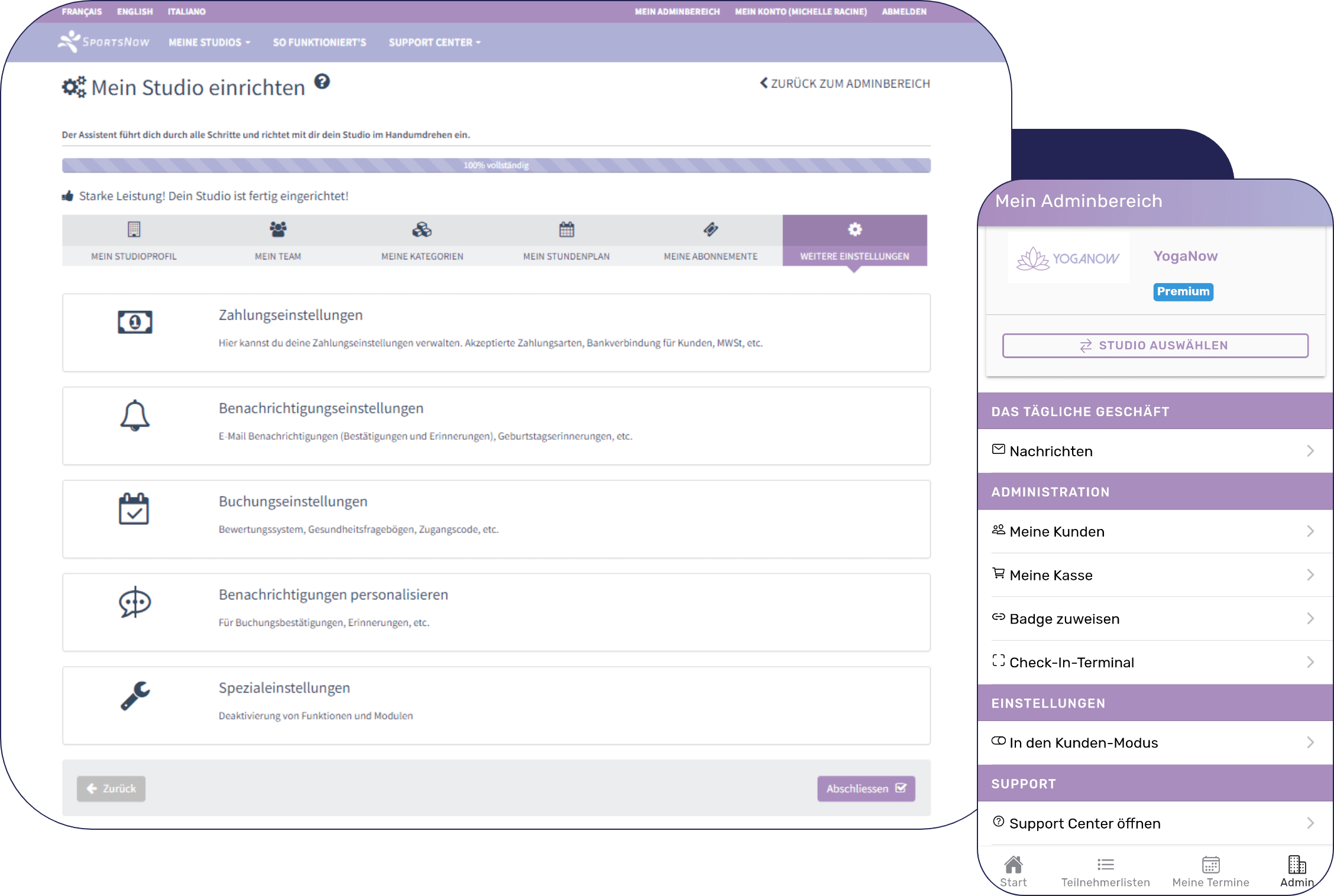 Viele umfangreiche weitere Einstellungen bezüglich Zahlungen, Buchungen und Benachrichtigungen lassen dich dein Studio genau auf deine Anforderungen zuzuschneiden.