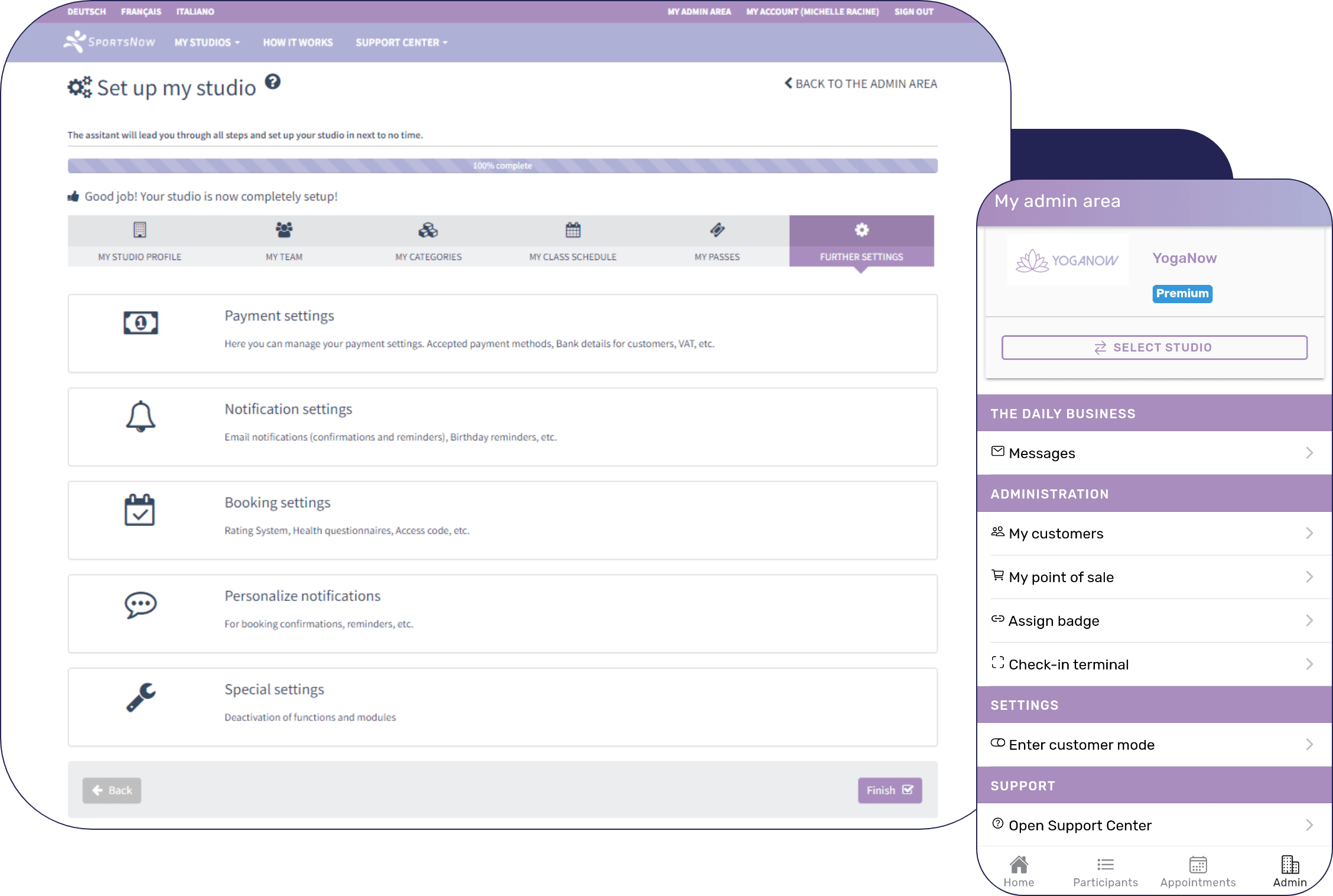 Grazie alle numerose impostazioni, potete modificare la vostra offerta e il vostro studio in qualsiasi momento e adattarlo alle vostre esigenze attuali. In questo modo è possibile tenere aggiornati il profilo dello studio, il team, gli orari e i pass.