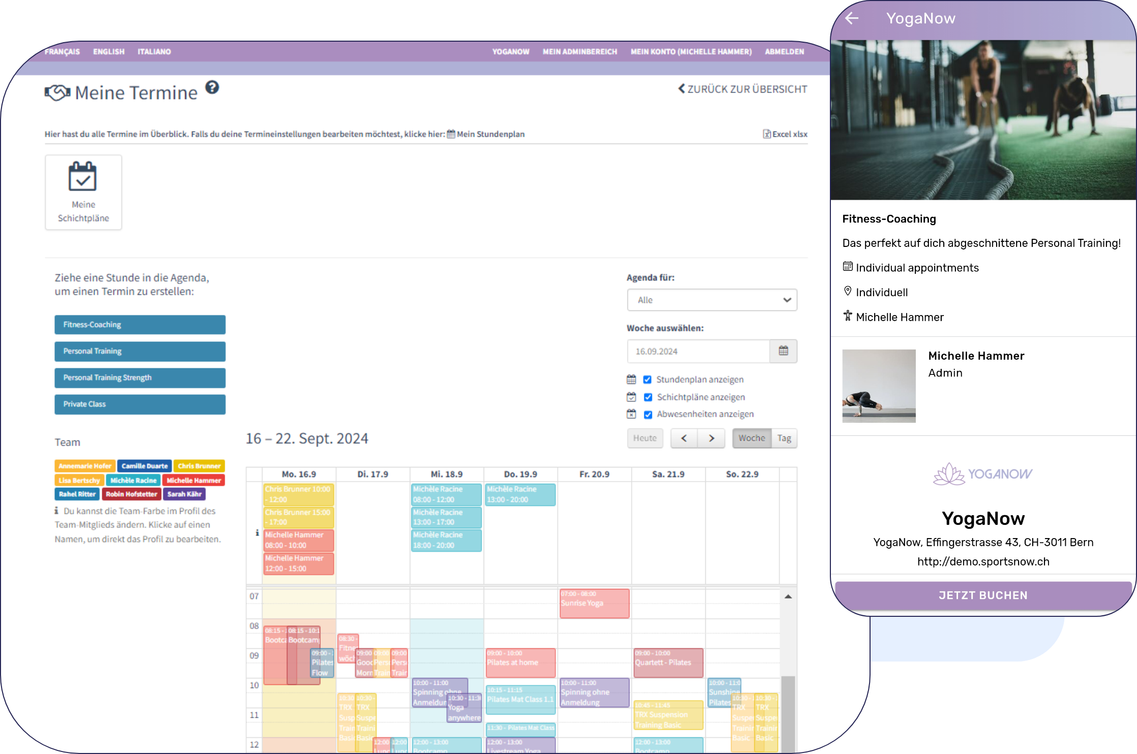 Erstelle die individuelle Terminbuchung für ein Personal Training, ein Gerät oder einen Raum, sodass sie für deine Mitglieder online buchbar sind. Dabei hältst du stets die Übersicht über die Termine und deinen Stundenplan und kannst alle gebuchten Termine jederzeit anpassen. Mit den Schichtplänen kannst du zudem sicherstellen, dass das entsprechende Teammitglied zum gewünschten Zeitpunkt verfügbar ist.