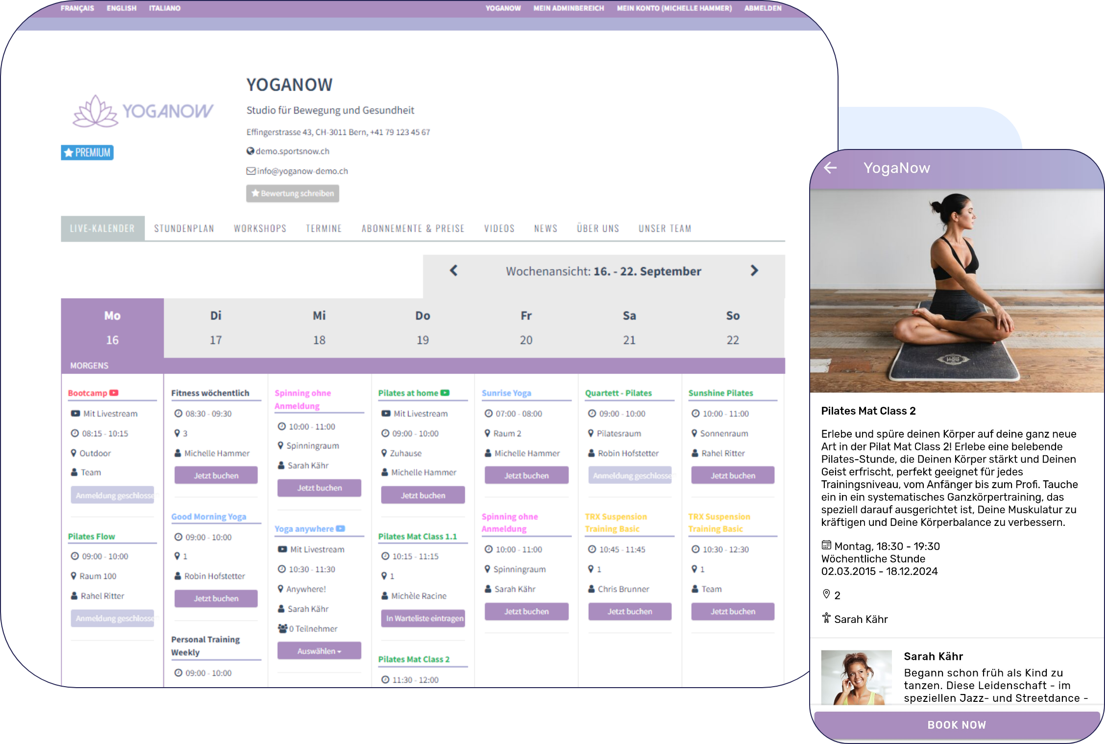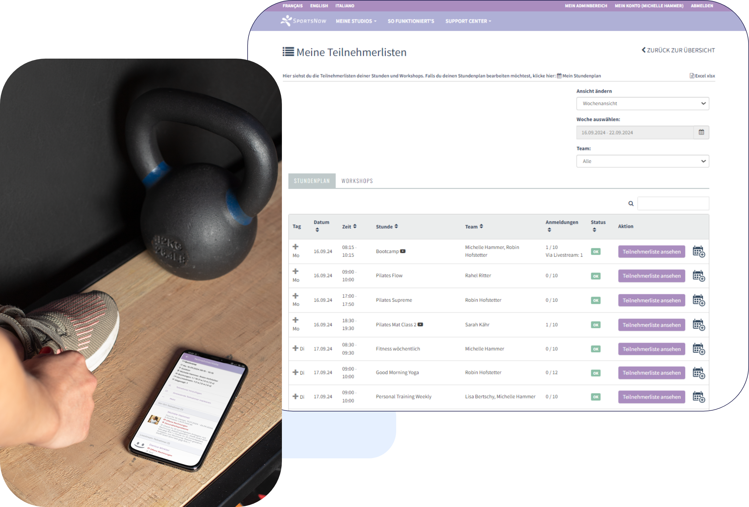 Für jede Stunde sowie jeden Workshop wird automatisch eine Teilnehmerliste erstellt, womit du sämtliche Buchungen stets im Überblick hältst. Ebenfalls kannst du dadurch die einzelnen Lektionen sowie die dazugehörigen Buchungen und die Mitglieder direkt bearbeiten und verwalten.