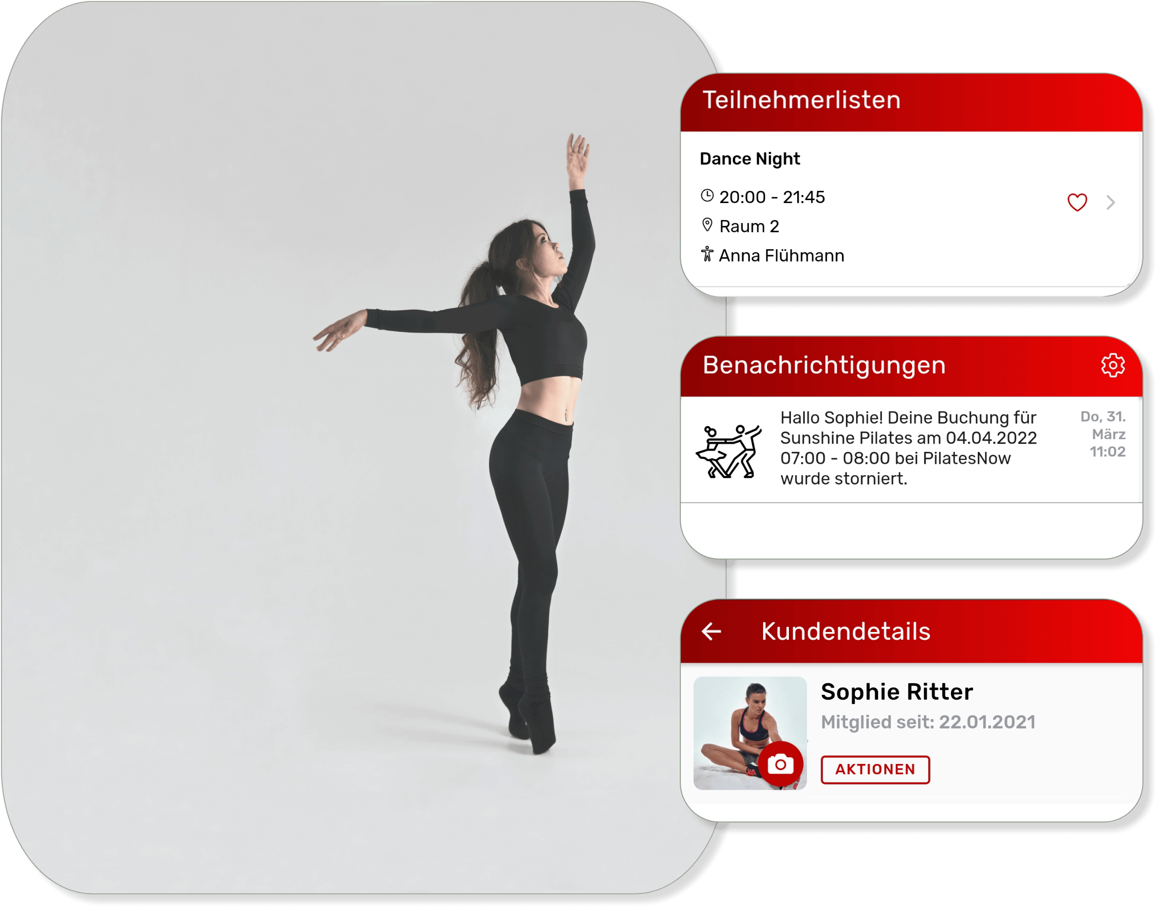 Für eine effiziente Verwaltung deiner Mitgliederdaten und Teilnehmerlisten sind alle Funktionen auch in der mobilen App verfügbar. Zudem werden mit den automatischen Push-Nachrichten deine Mitglieder und Instruktoren stets über wichtige Änderungen und Neuigkeiten informiert. Die App ist kostenlos und kann von dir, deinem Team und deinen Mitgliedern genutzt werden.