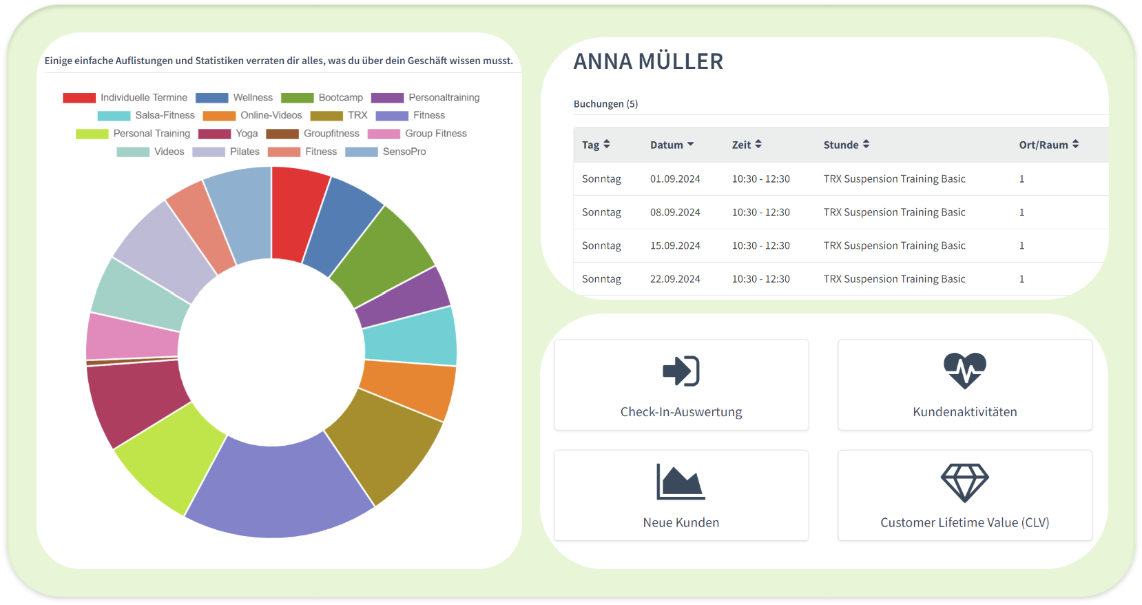 Identifiziere deine treusten Mitglieder, motiviere Mitglieder, die länger nicht mehr trainiert haben, kontaktiere interessierte Personen mit passenden Angeboten und erfahre allgemein mehr über die Aktivitäten deiner Kund:innen. Es stehen dir hilfreiche Tools zur Verfügung, um dein Angebot zu optimieren, die Kundenbindung zu stärken und auf die Bedürfnisse deiner Mitglieder zu reagieren.