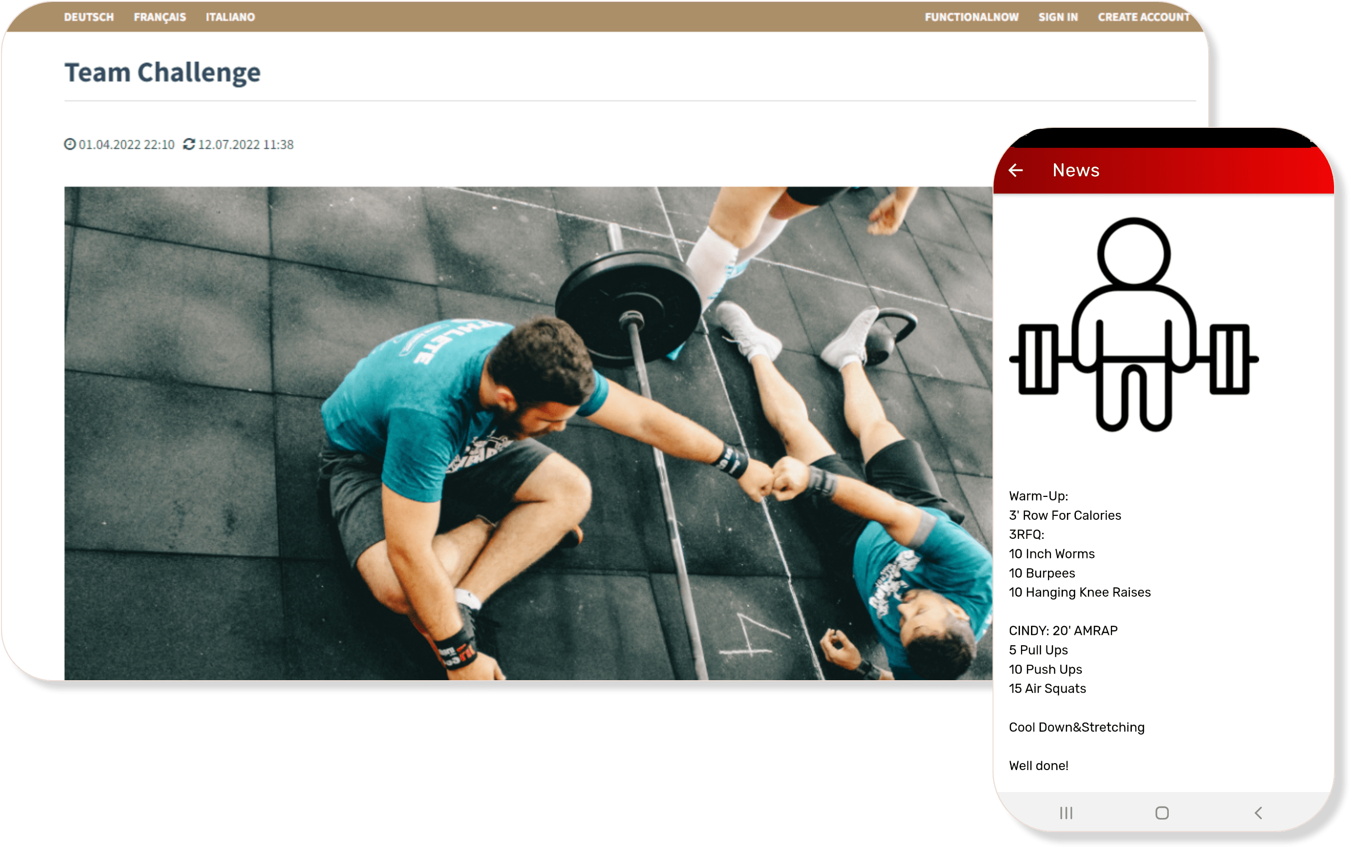 Do you want to share the «Workout of the Day» with your community, or do you have a common event coming up? With the SportsNow News page, you have the possibility to create your own posts and keep your members informed about all the latest news. A push message is automatically sent for new posts. This way, your members can view the WOD directly and start the workout motivated.