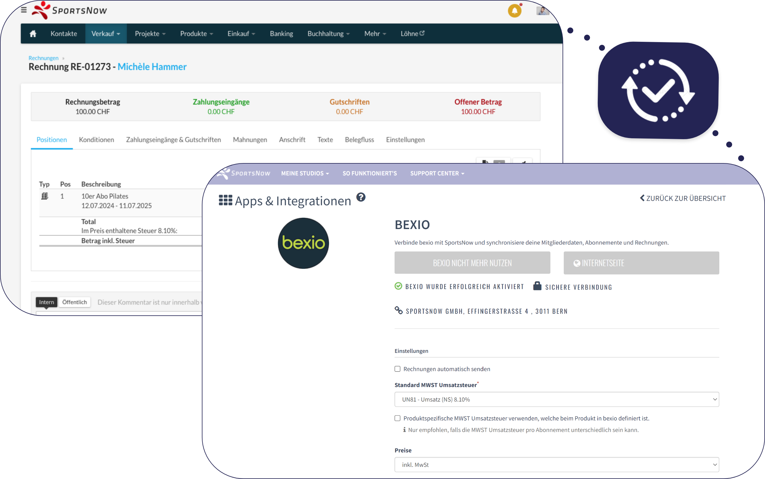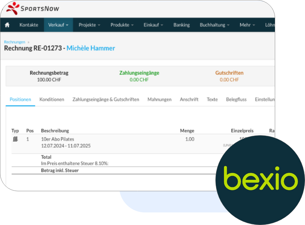 Professionelle Integration mit der Buchhaltungssoftware bexio - Erstelle Rechnungen in deinem eigenen Design und profitiere dank der automatischen Synchronisation von einem direkten Zahlungsabgleich.