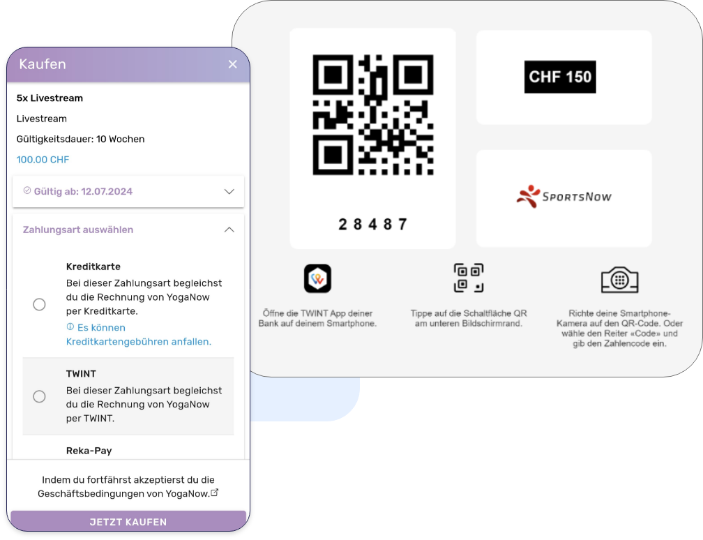 Schluss mit dem Hinterherjagen von unbezahlten Rechnungen – Reagiere auf unterschiedliche Vorlieben deiner Mitglieder und biete verschiedene Zahlungsmöglichkeiten an. Mit Kreditkarte, TWINT und Reka stehen dir sichere Zahlungsmittel zur Verfügung, die deinen Mitgliedern ein nahtloses Bezahlen der Abonnemente ermöglichen.