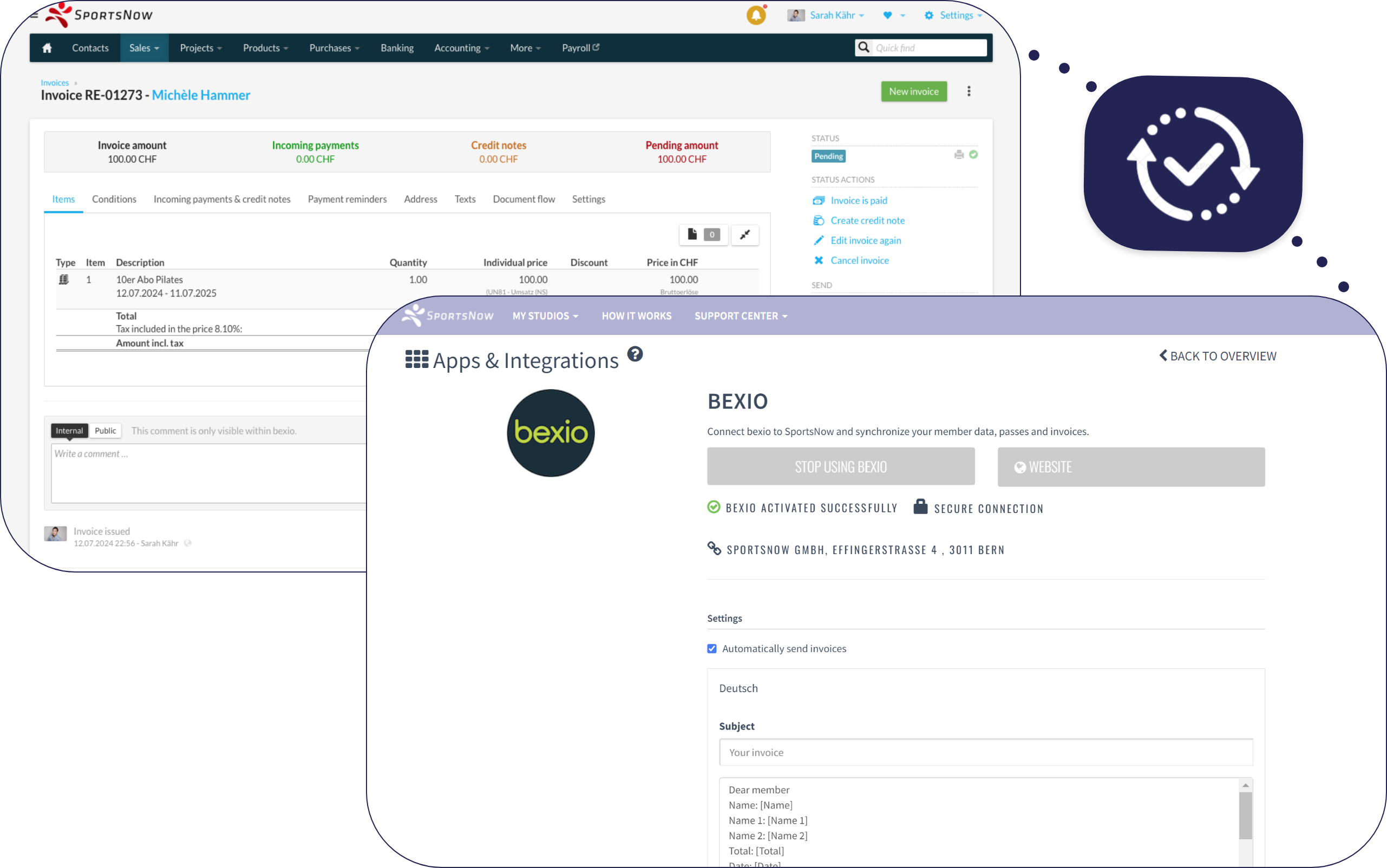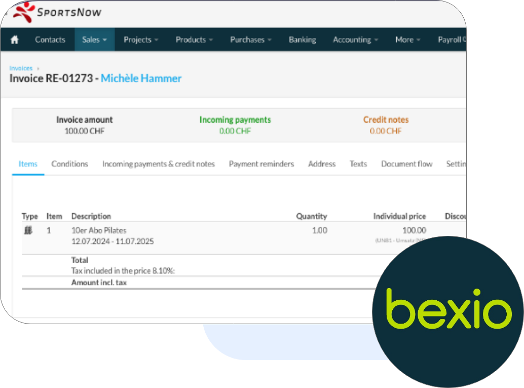 Professional integration with the accounting software bexio - Create invoices in your own design and benefit from direct payment reconciliation thanks to automatic synchronization.
