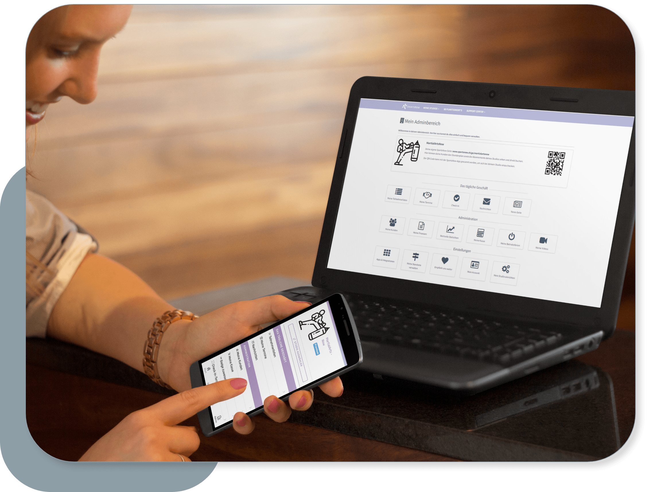 Für eine effiziente Verwaltung der Mitgliederdaten, Rechnungen und Teilnehmerlisten sind alle Funktionen auch in der mobilen App verfügbar. Mit der SportsNow App können sich deine Mitglieder jederzeit und von überall her für die nächste Stunde anmelden und einsehen, wer sonst noch an der Stunde teilnimmt.