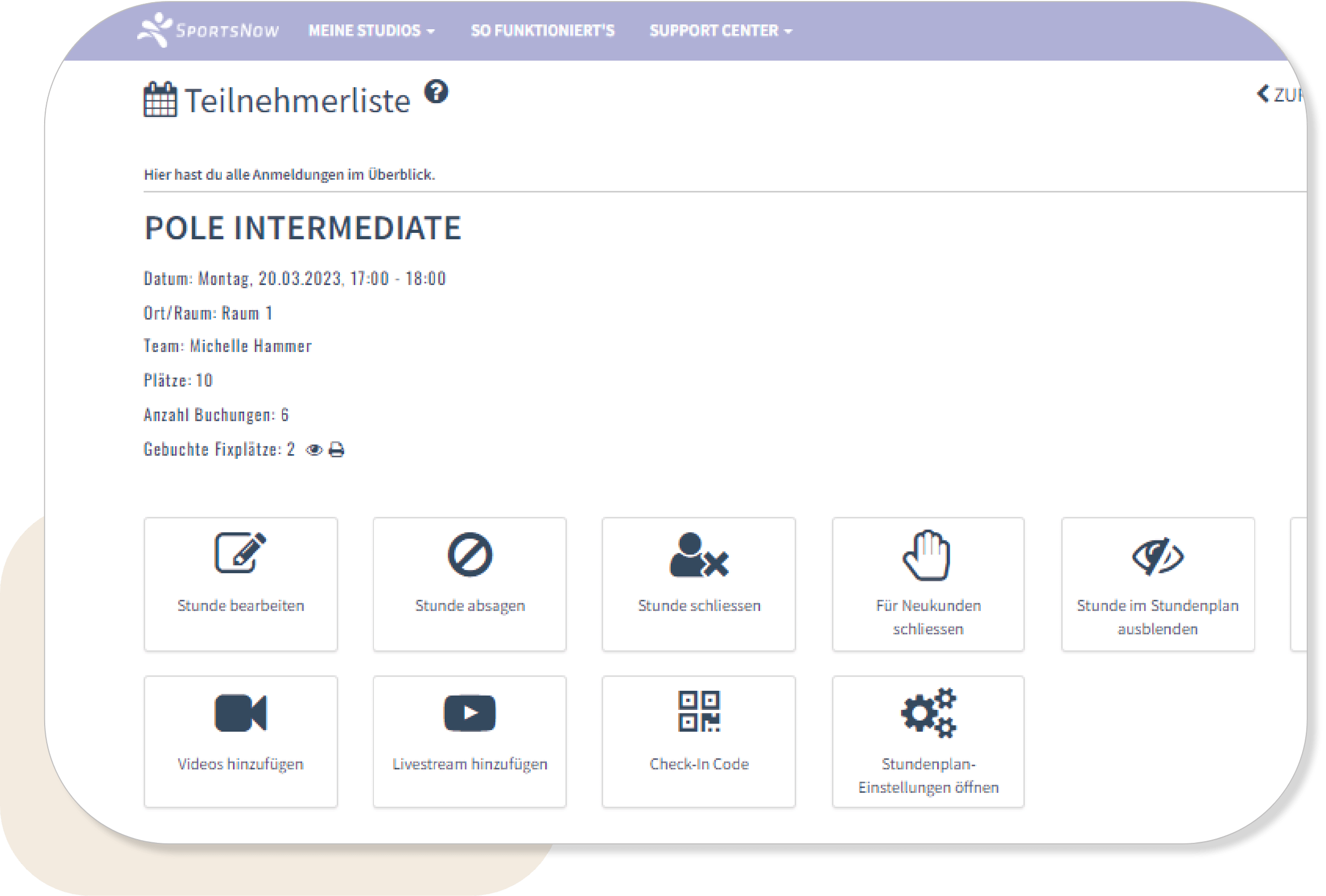 Besuchen deine Mitglieder regelmässig dieselben Stunden? Ermögliche mit dem System der Fixplätze ein automatisches Buchen einer Aerialsport- oder Poledance-Stunde für alle wöchentlichen Lektionen im Voraus.